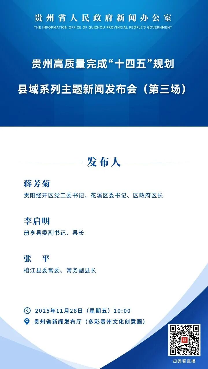 贵州省政府新闻办将于11月28日10:00在贵州省新闻发布厅(多彩贵州文化创意园)举行贵州高质量完成“十四五”规划县域系列主题新闻发布会(第三场)。