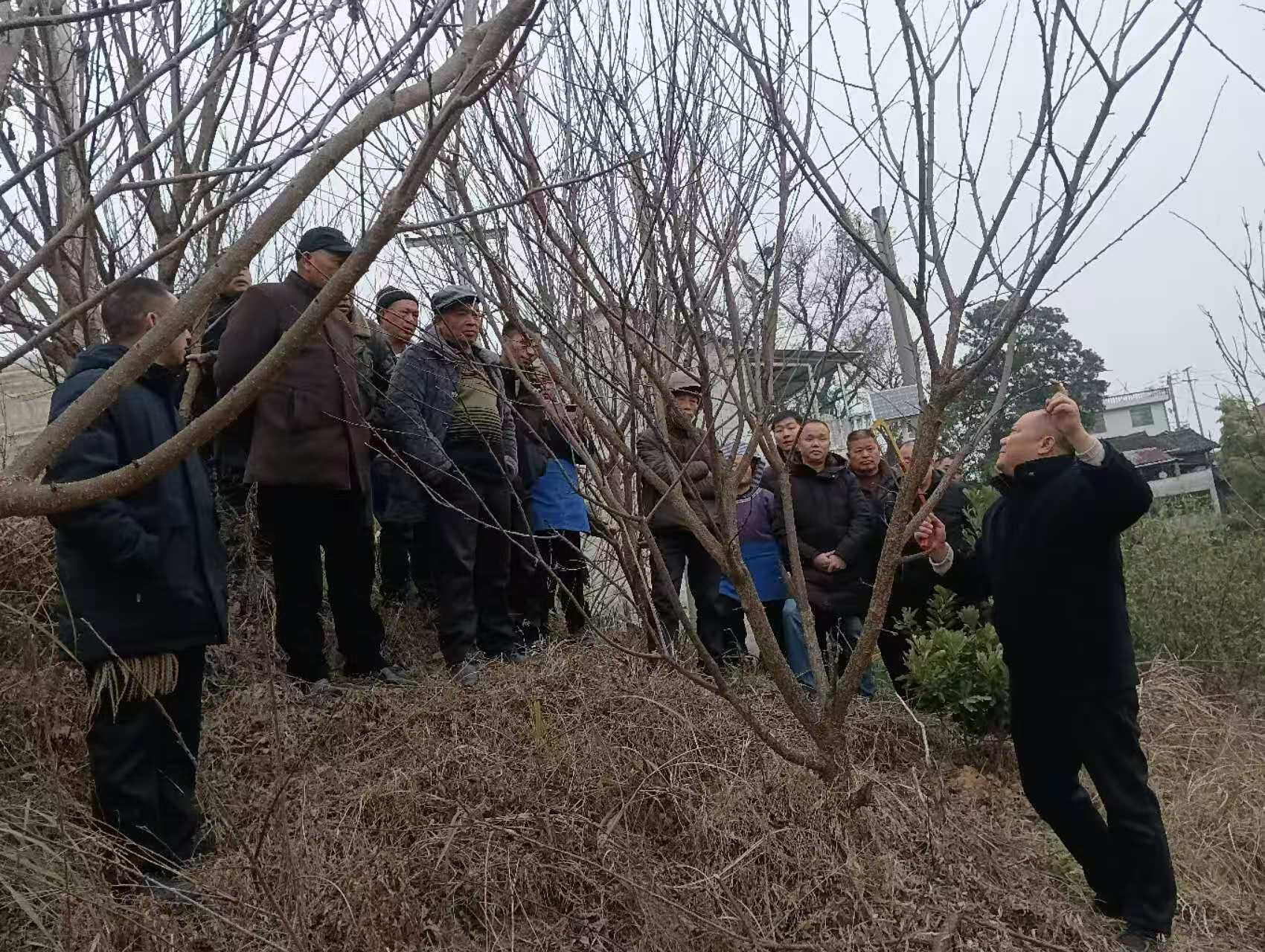 培训方式以现场实操进行,重点围绕蜂糖李冬季施肥、修剪、清园和涂干等内容展开。针对不同的树形树干,从施肥位置、施肥量、拉枝、剪除过密枝、树干涂白等操作要点做了示范,同时科普了涂白剂和清园处理的农药配方,现场发放技术资料50余份。