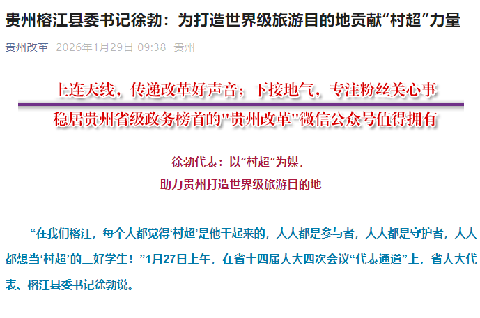 “在我们榕江,每个人都觉得‘村超’是他干起来的,人人都是参与者,人人都是守护者,人人都想当‘村超’的三好学生!”1月27日上午,在省十四届人大四次会议“代表通道”上,省人大代表、榕江县委书记徐勃说。