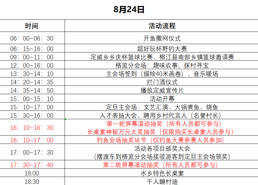 抓鱼比赛:限时20分钟,20分钟内抓鱼最多者获胜,参赛者可将抓到的鱼自行带走。