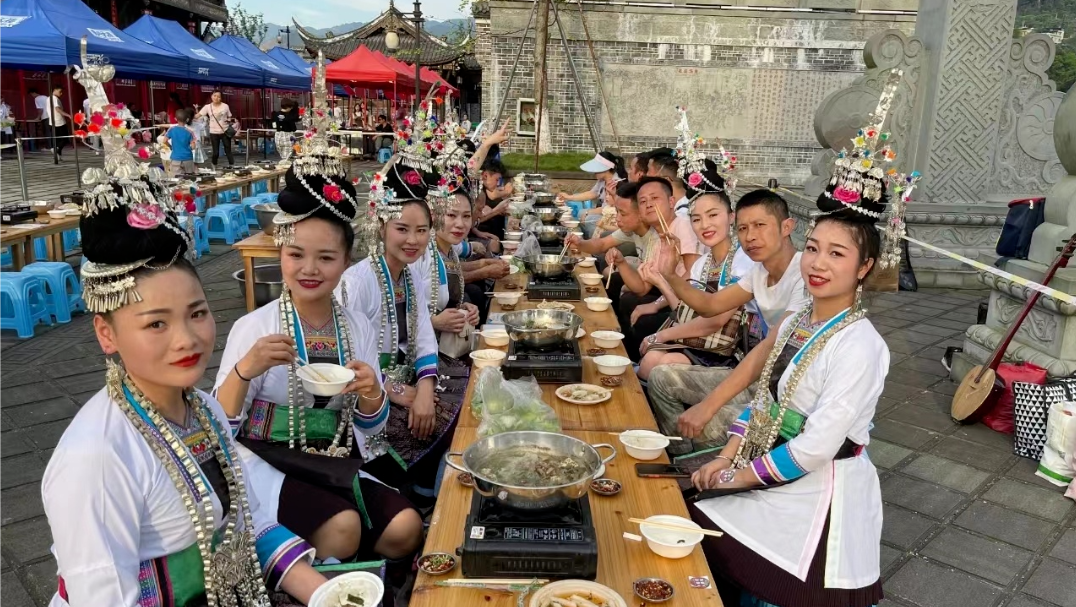 榕江县最隆重的待客之礼——千人长桌宴,丰盛的水族特色美食,伴随着高山流水一同进行,将桌子拼接在一起,摆满各种定威特有的美食,体验定威人民的热情
