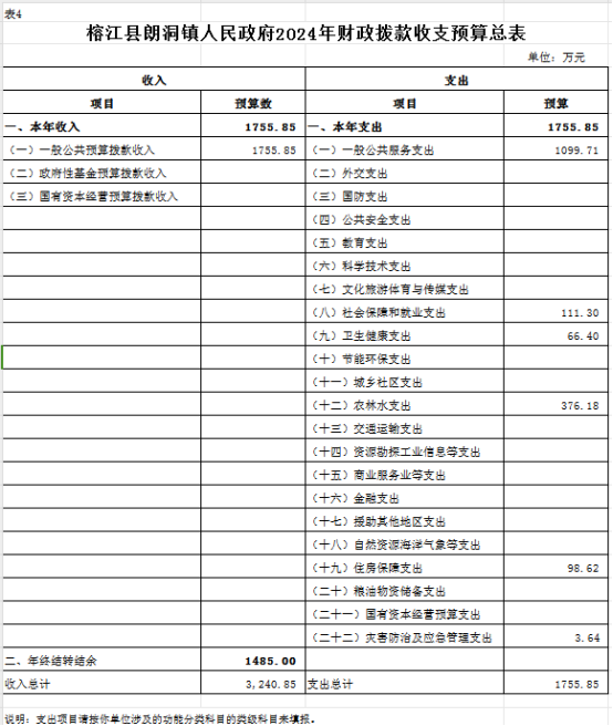 (四)榕江县朗洞镇人民政府2024年财政拨款收支预算总表