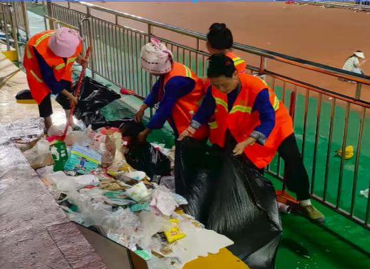 赛场内外,环卫工人也同步忙碌着,他们推着清洁车,拿着扫帚、拖把等工具,随时清理摊位周边的垃圾和油污。“我们要及时把垃圾清走,保证街面和球场干净整洁。”几位环卫工人一边忙着收拾垃圾,一边喃喃说道。