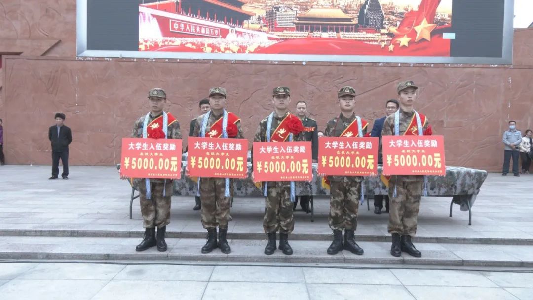 欢送仪式上,县领导给大学生新兵代表颁发一次性奖励金,并为新兵佩戴光荣入伍绶带。